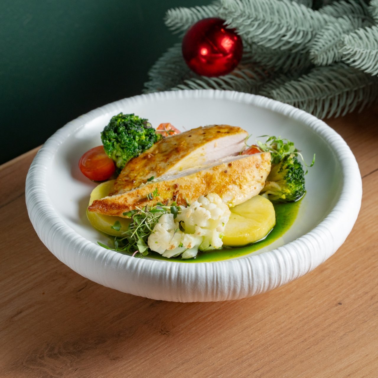 Куриный стейк с брокколи, цветной капустой, горошком и черри в медово-горчичном соусе с тимьяном и чесноком — яркое зимнее сочетание сладости и пряности.