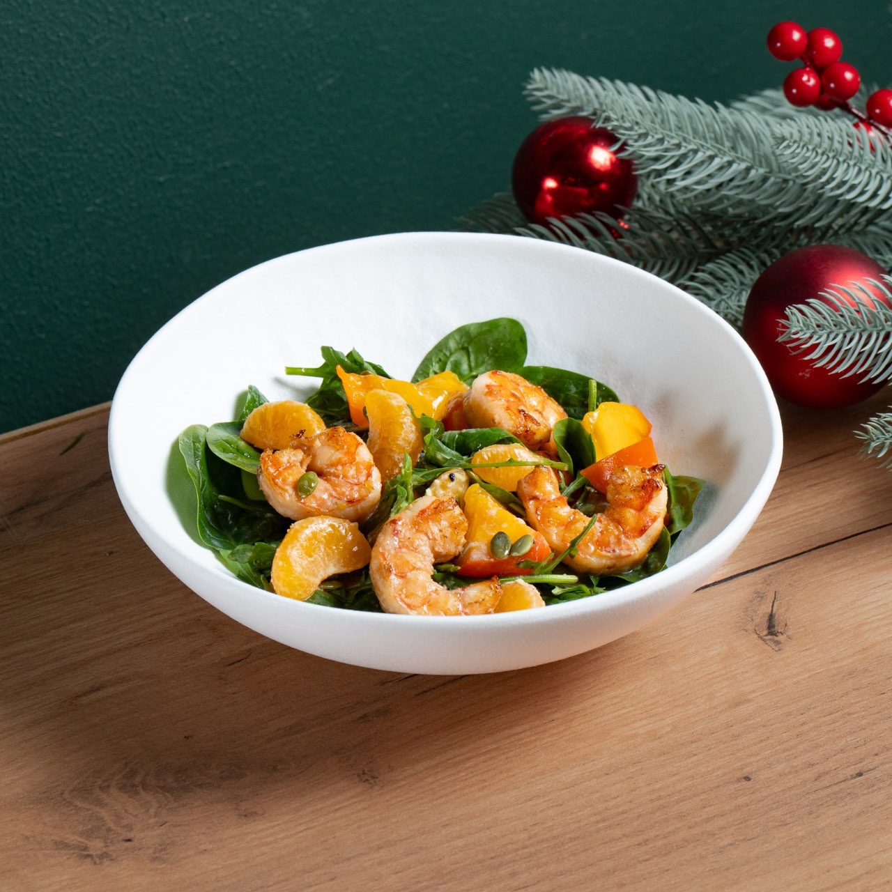 Салат с тигровыми креветками, хурмой, мандарином, смесью руколы и шпината, хрустящими семечками и кунжутно-медовой заправкой.