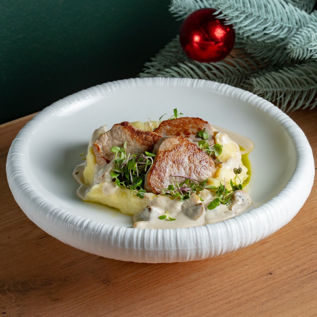 Свиные медальоны с картофельным пюре, крем-супом из белых грибов и черри с лёгкой ноткой чёрного перца — насыщанное тёплое блюдо.