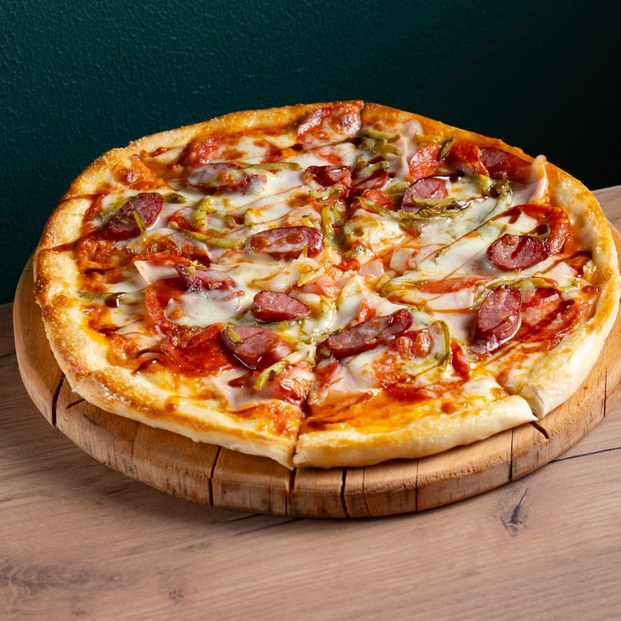 колбаса п\к, пепперони, перец халапеньо, шампионы, соус томатный, моцарелла. 420 г. 28 см